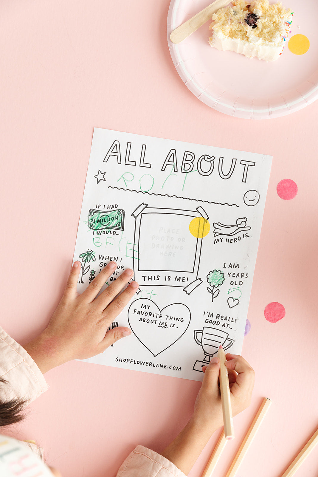 Flower Lane's All About Me printable is perfect for journaling and tracking your child's growth. Ideal for documenting milestones from the first day of school to the last, celebrating birthdays, or enjoying as a fun classroom activity, this printable includes engaging prompts like "If I had a million dollars I would ___?" and "My favorite thing about me is ___." Capture your child's unique personality and create lasting memories while having a blast together.